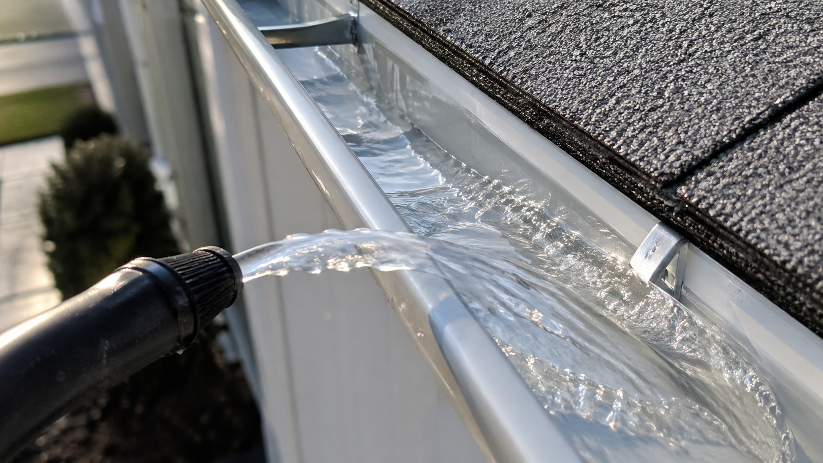 We flush and check the downspouts so the water path is cleared from the gutter channel down through the outlet.
